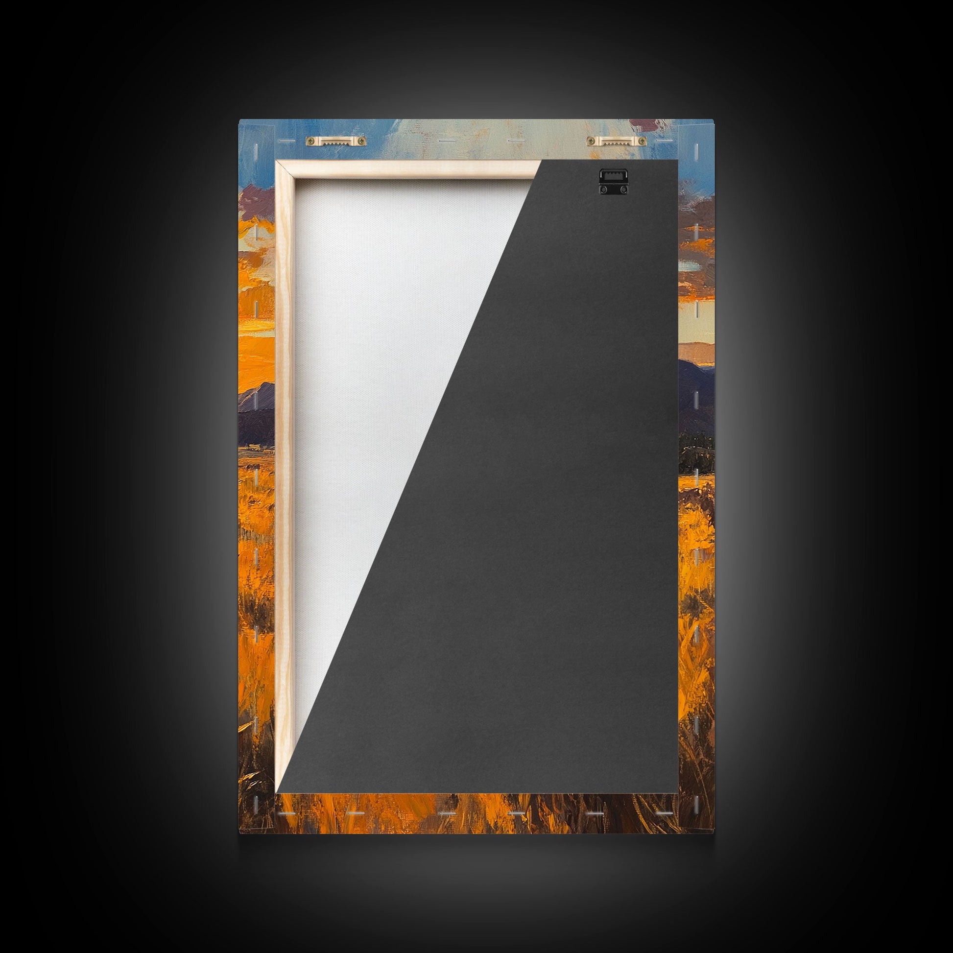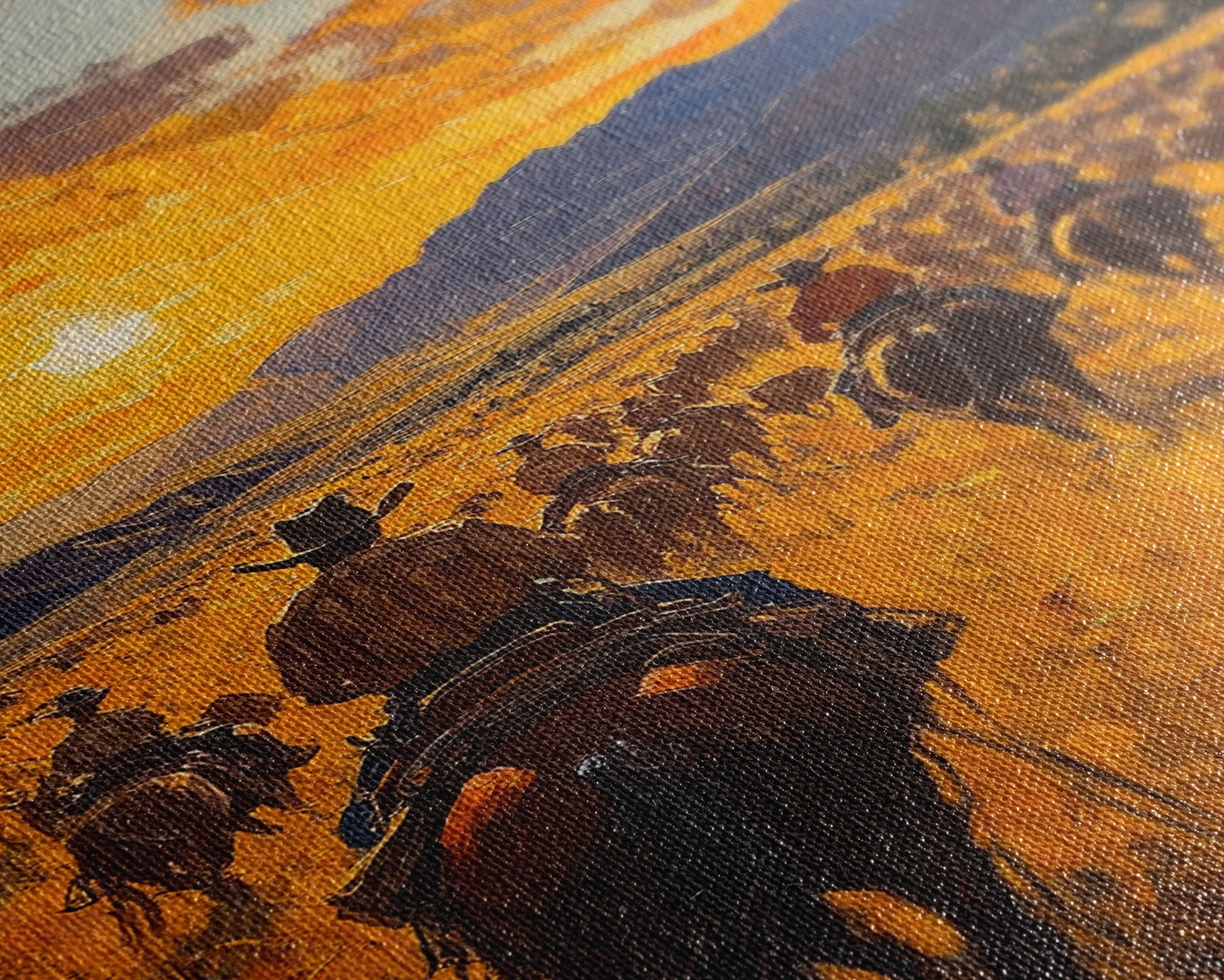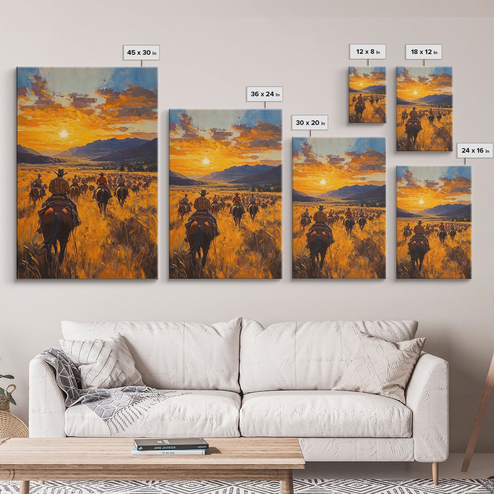 Cowboy Riders at Dusk Framed Canvas Print, Warm Sunset Western Scene with Riders on the Plains, Fall Decor Ranch Homes and Country Wall Art