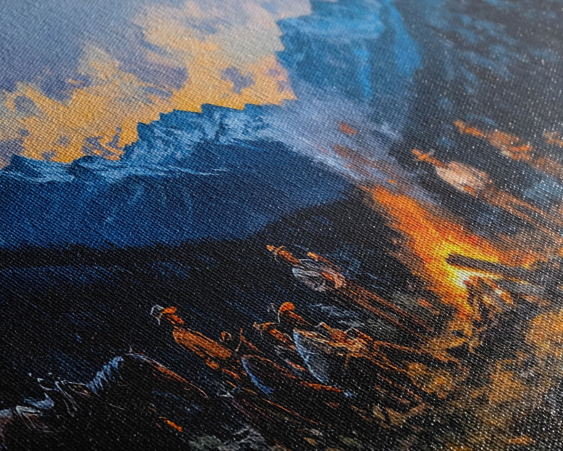 Framed Canvas Print Western Cowboys Campfire Evening Art Landscape Rustic Winter Mountain Home Decor Extra Large Wall Art Gift