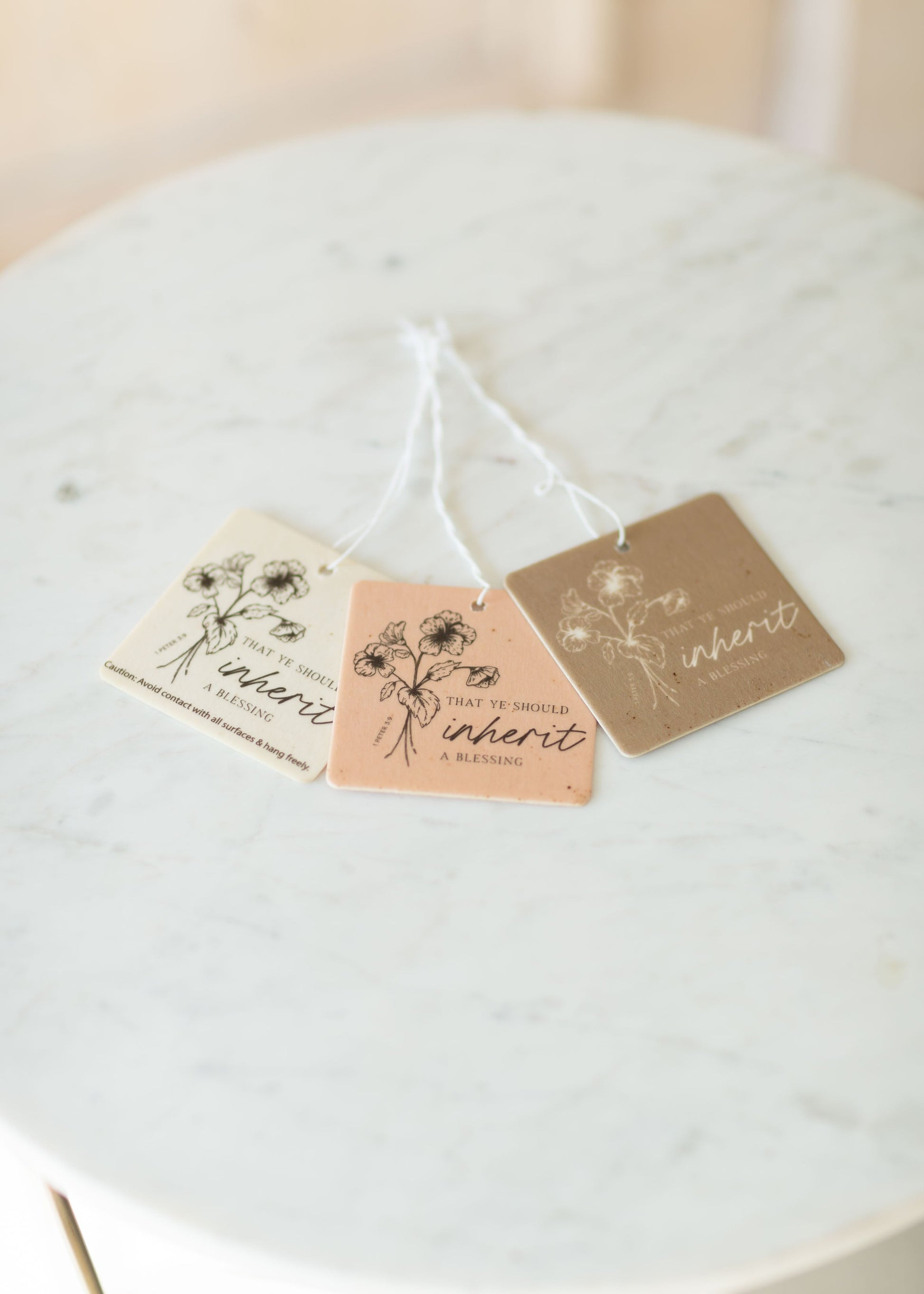 Hang the Inherit Air Freshener in your vehicle or around your house for a fresh scent all day long. Adorned with a hand drawn flower design and a KJV bible verse that reads "That ye should inherit a blessing" 1 Peter 3:9. A wonderful reminder and so beautiful.