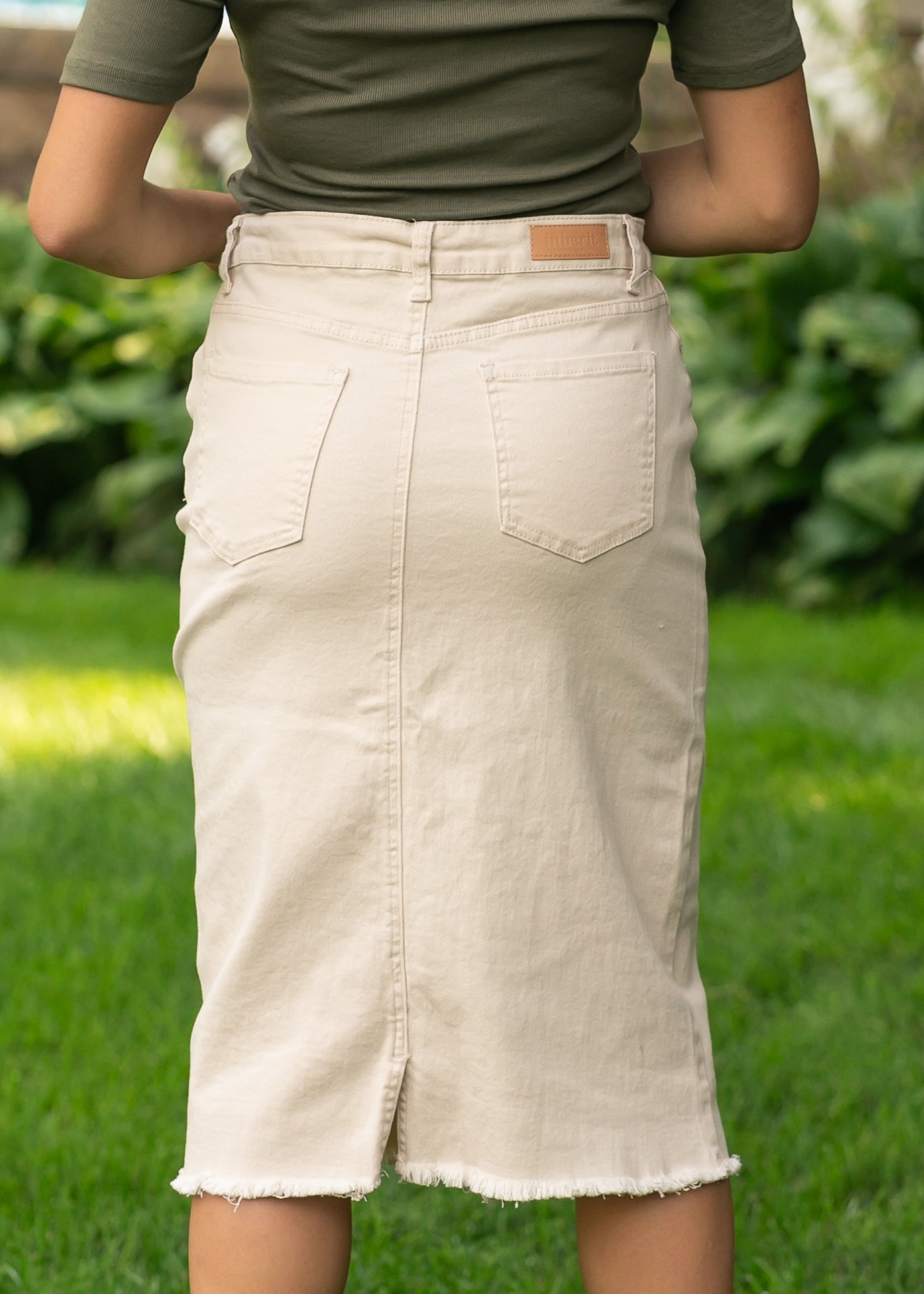 The Kobe Raw Hem Midi Skirt is a straight cut, neutral wash denim with a great amount of stretch! It has four buttons down the front for a fun look, a short back slit for walkability, and our Inherit tone-on-tone faux leather logo patch on the back! This skirt is a timeless style that has been threaded with purpose™.