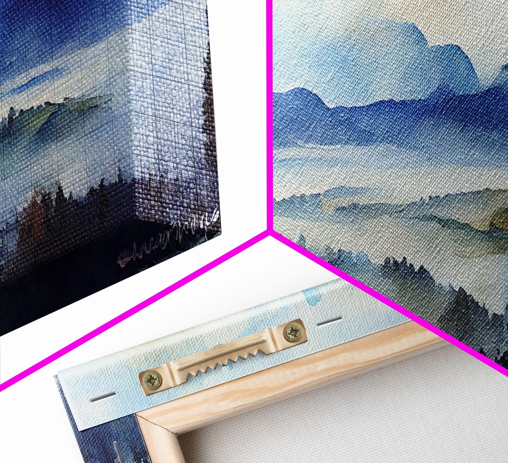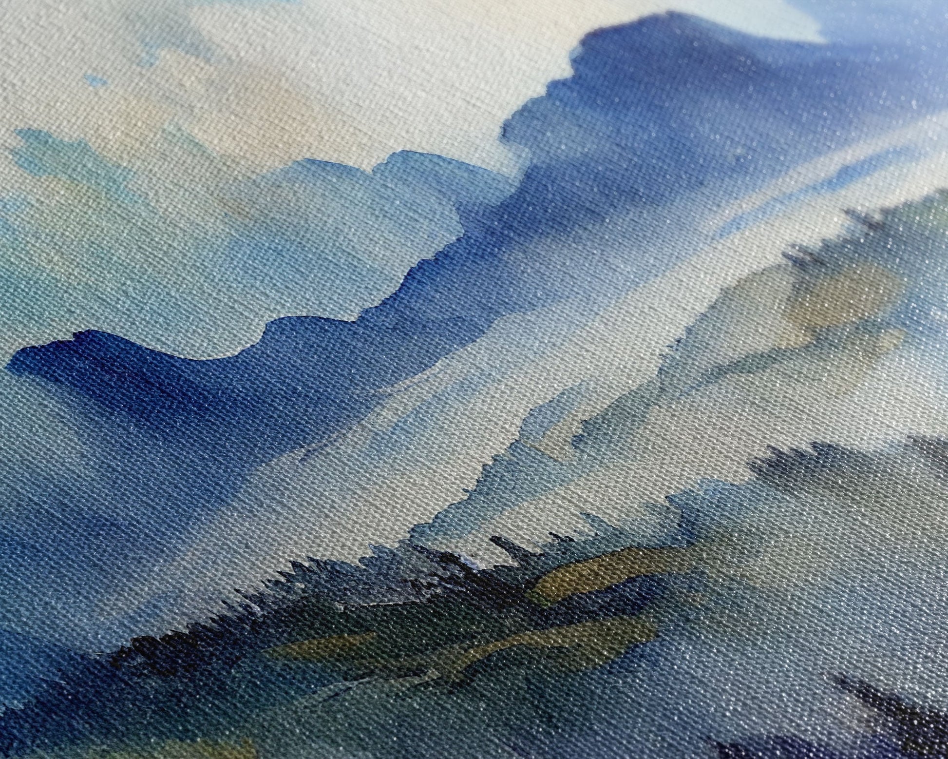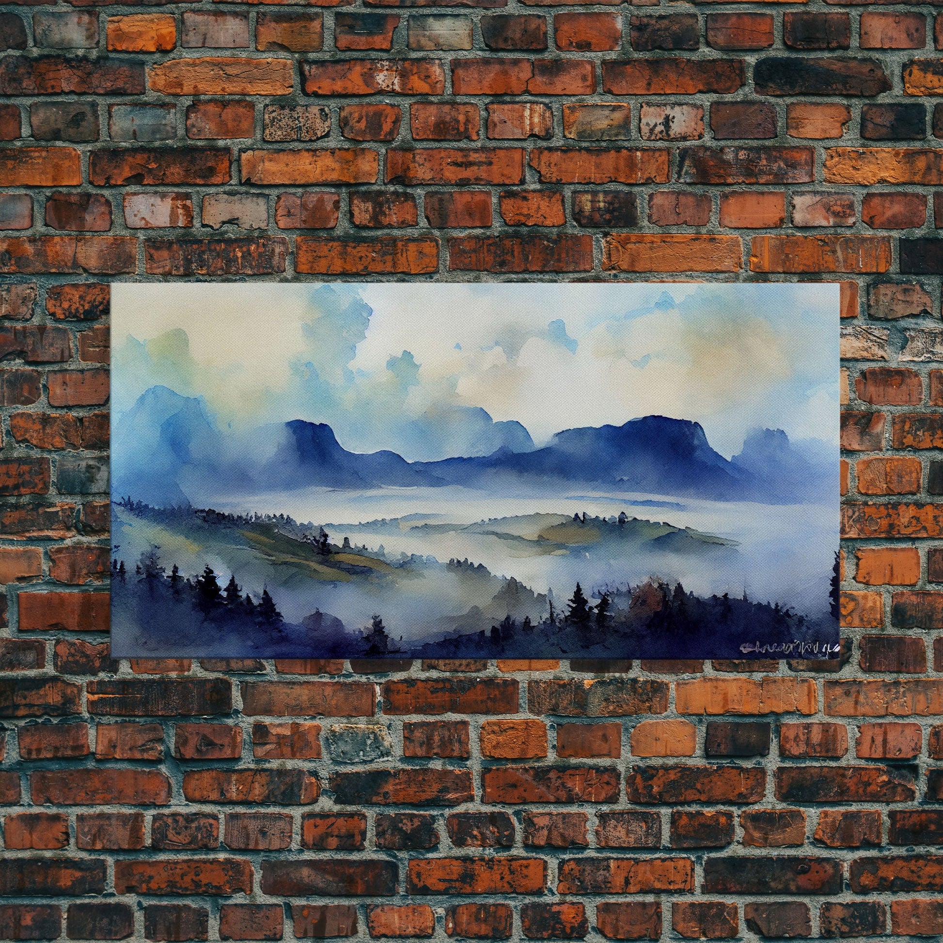 Panoramic Blue Mountain Valley Watercolour Art Canvas Print, Misty Rolling Hills Watercolor Landscape Painting Extra Large Panorama Print