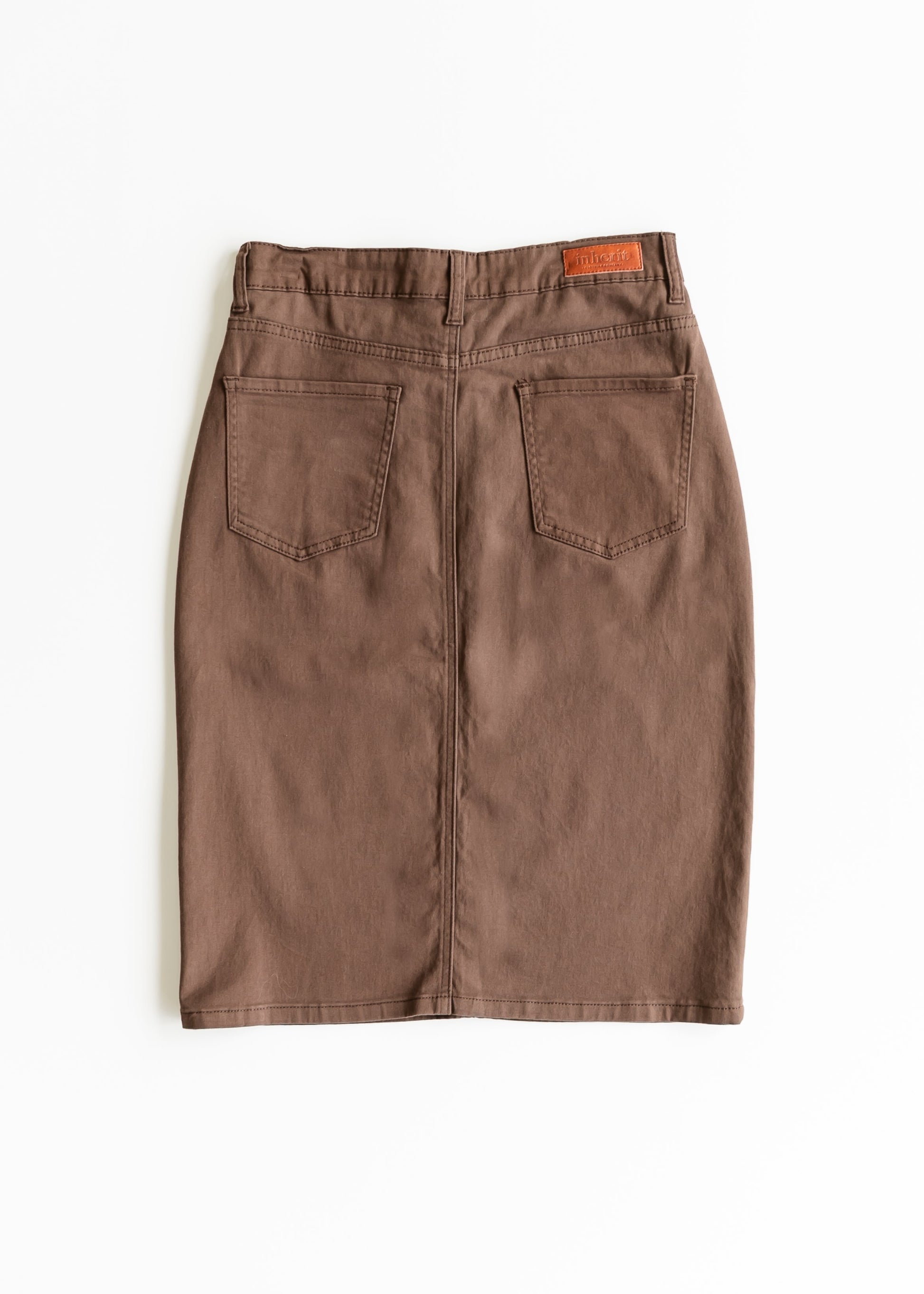 Our best-selling skirt will be a staple piece in your wardrobe! An Inherit Design, the Remi Denim Midi Skirt is cut with a modest and classic straight fit. This colored denim skirt has a finished bottom hem and will be a go-to time and time again for any occasion! This skirt has awesome stretch for total comfort and no back slit while still allowing for unconstrained walking.